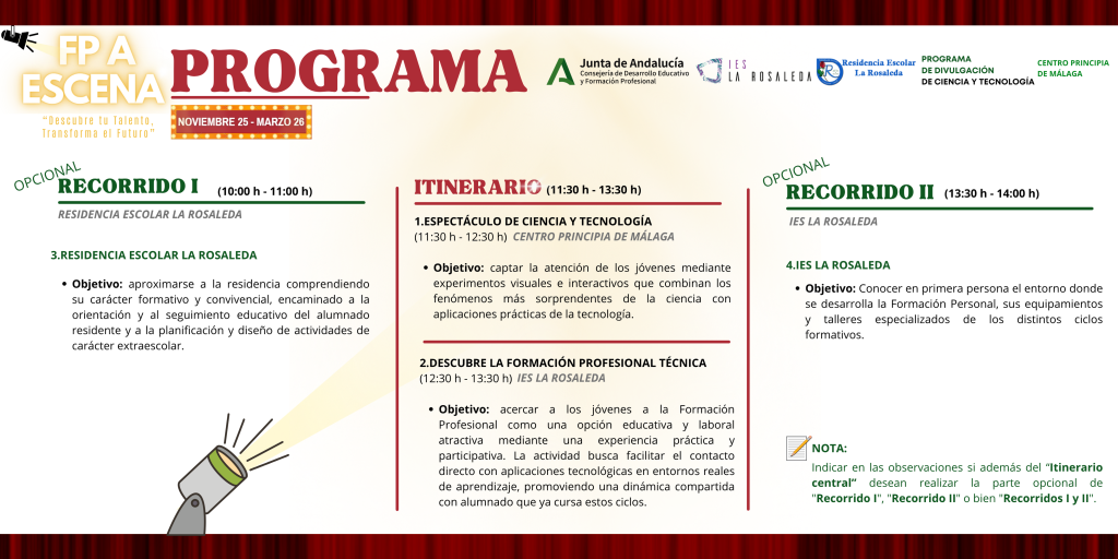 El programa de actividades FP A ESCENA MÁLAGA 2025 tiene como propósito principal mostrar a los jóvenes las posibilidades de las profesiones científicas-técnicas a través de una experiencia dinámica e inspiradora. Este programa busca fomentar el interés por la innovación, el aprendizaje práctico y el desarrollo profesional, destacando cómo la Formación Profesional se convierte en una vía sólida para transformar ideas en realidades y construir un futuro lleno de oportunidades.